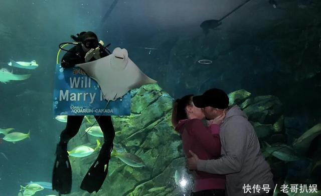 求婚现场的水族馆嘉宾 多伦多瑞普利水族馆内,男友正在求婚,一只鳐鱼不断在背景中游过,成功抢走了所有镜头的焦点。网友直呼:"太可爱了!"